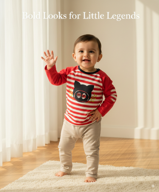 Red Striped Full-Sleeve Baby Shirt with Bear Patch Organic Cotton Art No. CM0045